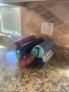 Oh and if you’re a large family like us, you know that storage is a BIG problem. We consistently have six water bottles sitting on our counters (Luis needs to drink more water!) or lying around the house and it can really drive me mad. So, I found this super neat water bottle holder (AMAZON Link) that we place on the end of the counter so now everyone knows where to put their bottle when they aren’t using it, and everyone knows where to find it when they need it!