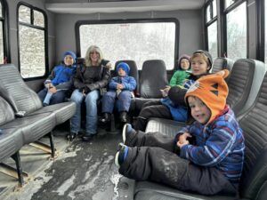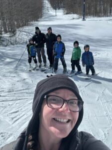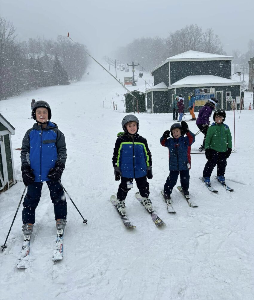 The next morning, it was time to hit the slopes! Having learned the basics during a ski day at Mount Abrams in Maine earlier in the year, the four big boys (ages 5-10) were eager to show off their skills. Papi, Grampa, and I joined them, armed with an arsenal of patience, breaks, and encouraging words. The conditions were perfect – crisp, clear skies and a layer of fresh powder that made every turn an adventure. This time around, the boys weren’t just tentative snowplowers; they were actually starting to get the hang of it! They were learning to “pizza” (feet pointed in) for control and “french fries” (feet parallel) for speed, and even managed some impressive partial turns down gentle slopes.