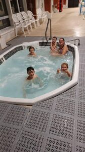 After a delicious dinner (fueled mostly by the promise of Ben and Jerry’s ice cream!), we bundled up for a short walk to the resort’s indoor splash pad, pool and hot tub. The boys, especially, were in a frenzy of excitement. The splash pad was small, but they were able to turn cranks to fill buckets of water and slide down a slippery water slide together for some simple fun. The hot tub was a welcome respite for weary muscles (mine!), and the laughter echoing through the pool area was a symphony of pure, unadulterated joy.