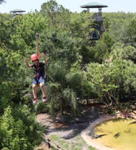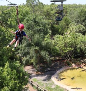 Of course, our little daredevils wouldn’t be satisfied with just watching. Enter the Gator Gauntlet Zip Line! This seven-line zip line adventure took us soaring over lush landscapes, crystal-clear ponds…and yes, even over some of those very same gators we’d just been staring at. The boys were a mix of nervous giggles and exhilarated screams as they flew through the air, and let me tell you, the view from up there was breathtaking. Seeing the park from that perspective really added to the experience, and it was a fantastic way to burn off some of their boundless energy.